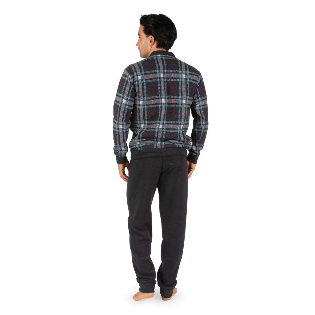 Pigiama a serafino a manica lunga in caldo cotone Punto Milano della linea Mariotti Lab. Interamente realizzata in Italia, questa linea di pigiameria utilizza cotoni di alta qualità per garantire il benessere durante le ore di relax in casa. Il modello del pigiama è molto comodo ed ha una vestibilità confortevole, leggermente aderente. Il tessuto in Punto Milano è caldissimo e corposo, perfetto per essere utilizzato anche come abbigliamento casa. La fantasia di quadrettoni della maglia è inusuale e moderna, particolare e sportiva, anche grazie al colore Grigio Antracite del fondo.