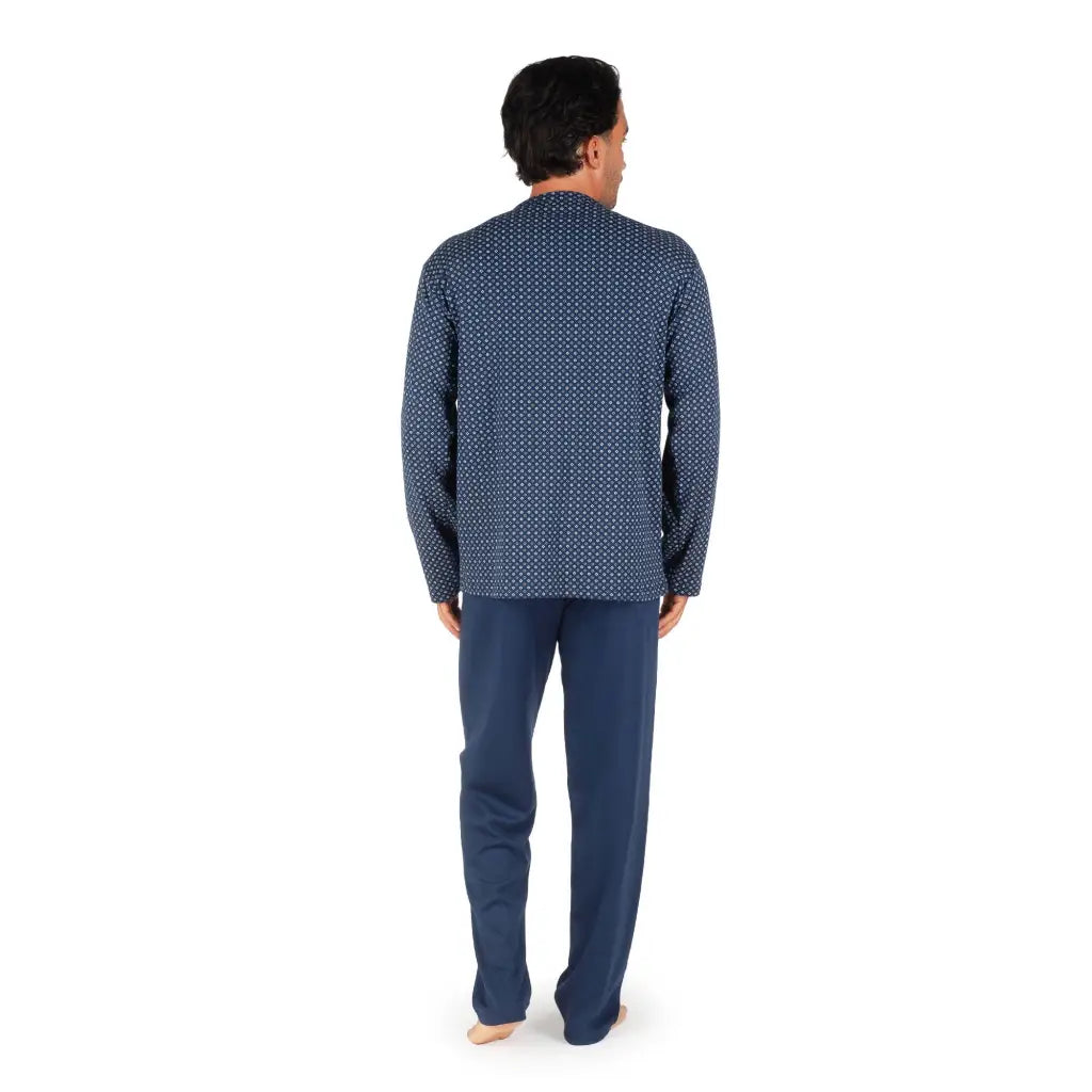 Pigiama uomo a serafino a manica lunga dritto in caldo cotone Interlock invernale di Mariotti Lab. Questo modello è interamente creato e realizzato in Italia con materie prime di pregio e filati unici per permettere un buon riposo durante la notte. Il pigiama ha una vestibilità morbida e confortevole, non aderisce troppo ed è reso funzionale e pratico dalla giacca senza polsino. La giacca è realizzata in una piccola fantasia sui toni del blu, molto elegante, che si lega perfettamente alla tinta unita del pantalone. Il modello ha una vestibilità rilassata e molto particolare. Tutta la linea di pigiameria uomo e donna Mariotti Lab è Made in Italy.
