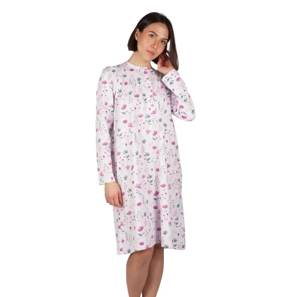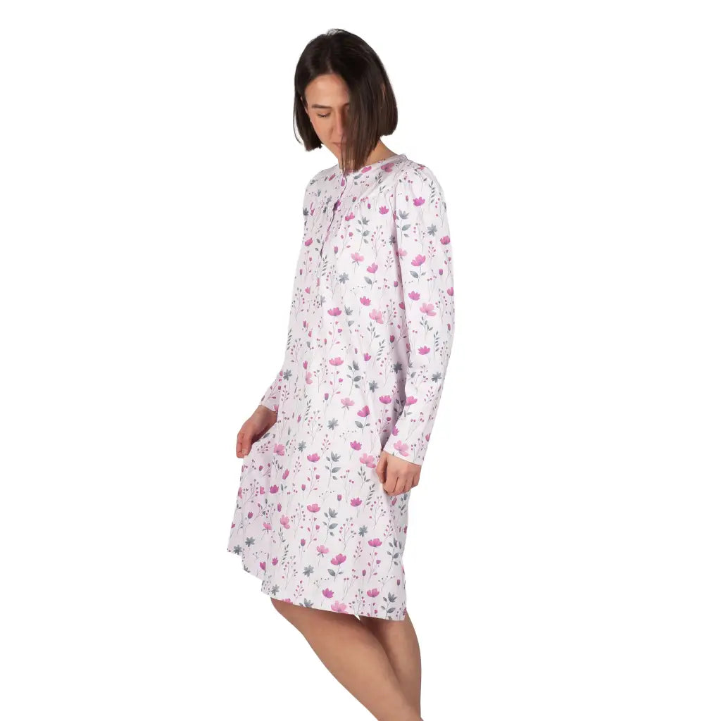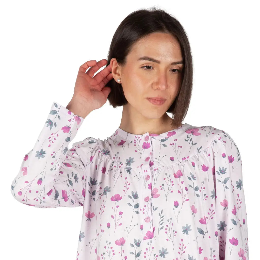 Camicia da notte serafino a manica lunga in cotone leggero della linea Mariotti Lab. Questo modello nasce dalla necessità di dare ad ognuna capi che accompagnino il riposo notturno. Il modello è leggermente svasato, per non intralciare il movimento ed è realizzato in un fine puro cotone morbido e leggero, adatto alle stagioni estiva e primaverile. La fantasia floreale ha un sapore comunque moderno e molto particolare anche grazie ai colori sobri e ben studiati. Lo sprone, taglio ad U sia davanti che dietro, dona ampiezza e agio al movimento così da garantire il massimo del comfort all'indosso.