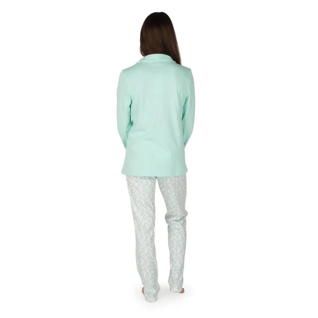 Pigiama donna aperto davanti con colletto a manica lunga in caldo cotone Interlock di Linclalor. Questo storico brand italiano è celebre per i modelli strutturati benissimo e per i cotoni di alta qualità. Il modello è un classico intramontabile, un pigiama a manica lunga con colletto e con apertura totale sul davanti che facilita l'indosso ed è perfetta anche per un'eventuale degenza. La giacca è realizzata in una tinta unita in colore verde menta molto particolare, si abbina perfettamente al pantalone con libellule sempre sui toni del verde e del glicine. Il modello ha un comodo taschino sul davanti. Il tessuto in morbidissimo caldo cotone è perfetto per il riposo durante le rigide notti invernali.