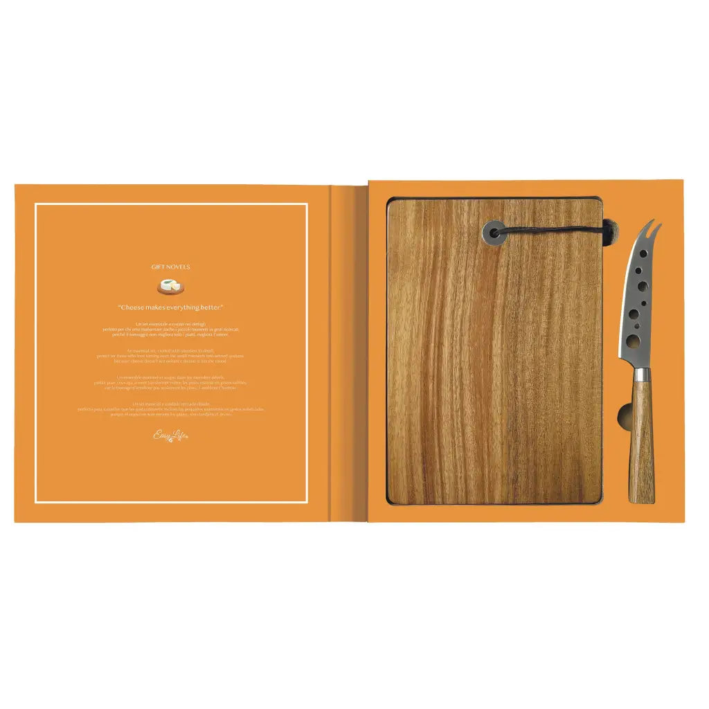 Set formaggio 2 pezzi della linea Gift Novel di Easy Life. Scopri la praticità e l'eleganza con questo set di accessori per formaggi. Composto da un tagliere in legno ed un coltello, questo set essenziale trasforma ogni momento di degustazione in un'esperienza raffinata. Perfetto per gli amanti dei formaggi, per chi ama intrattenere con stile o come regalo elegante per occasioni speciali, questo set è essenziale e curato nei dettagli. La simpatica confezione a libro renderà ancora più divertente regalare questo meraviglioso set.