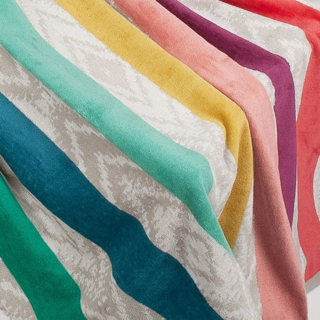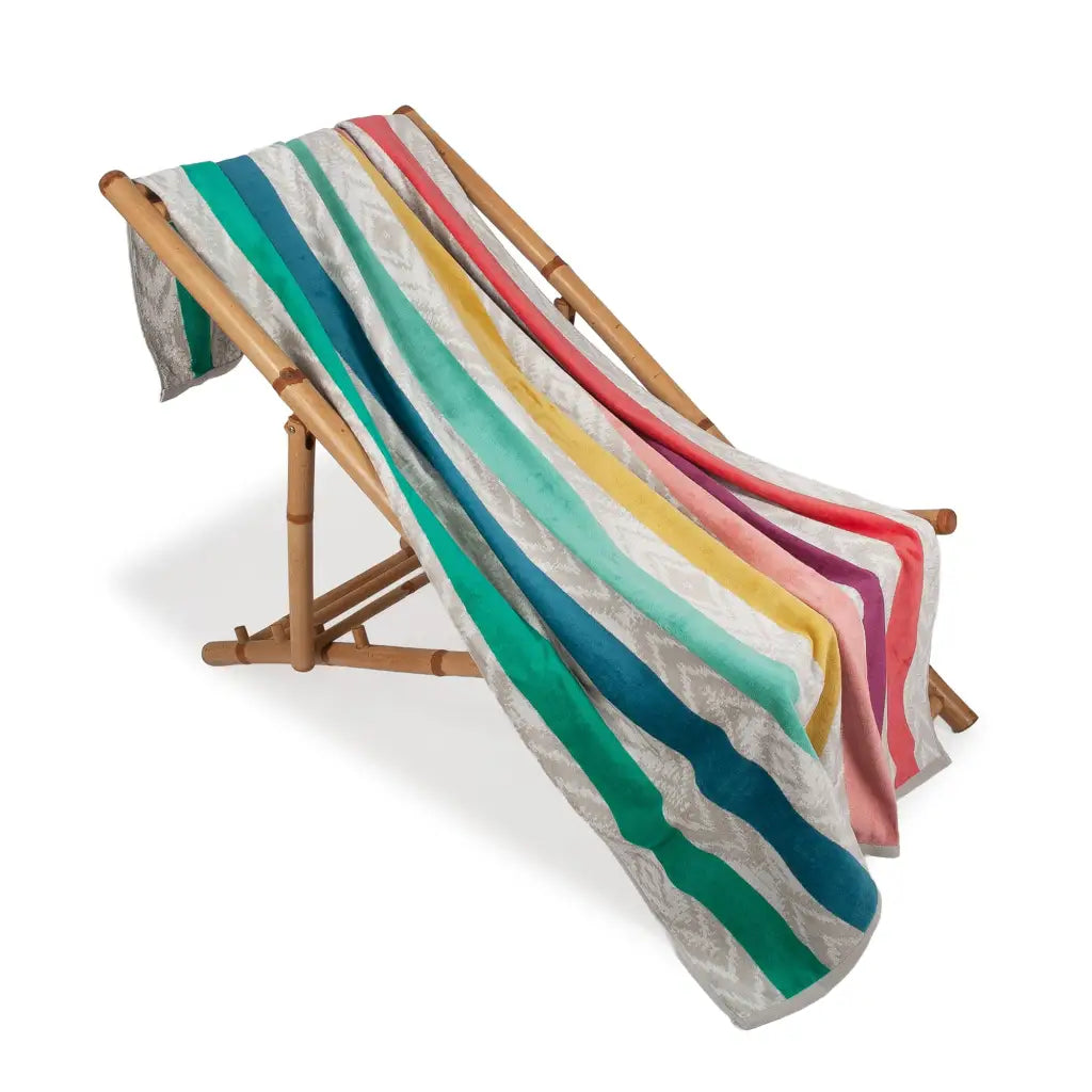 Telo mare unisex in misura maxi 100x180 cm in spugna effetto velour. Dai colori vivaci e brillanti, ha una fantasia di righe dal gusto etnico resa particolare e di tendenza dagli abbinamenti cromatici e dai colori vivacissimi. Comodissimo per il lettino sulla spiaggia, è realizzato in una spugna corposa e morbida che assorbe bene l'acqua e si asciuga piuttosto rapidamente.