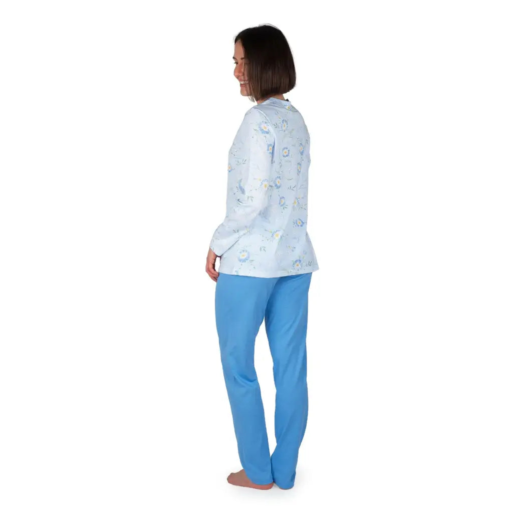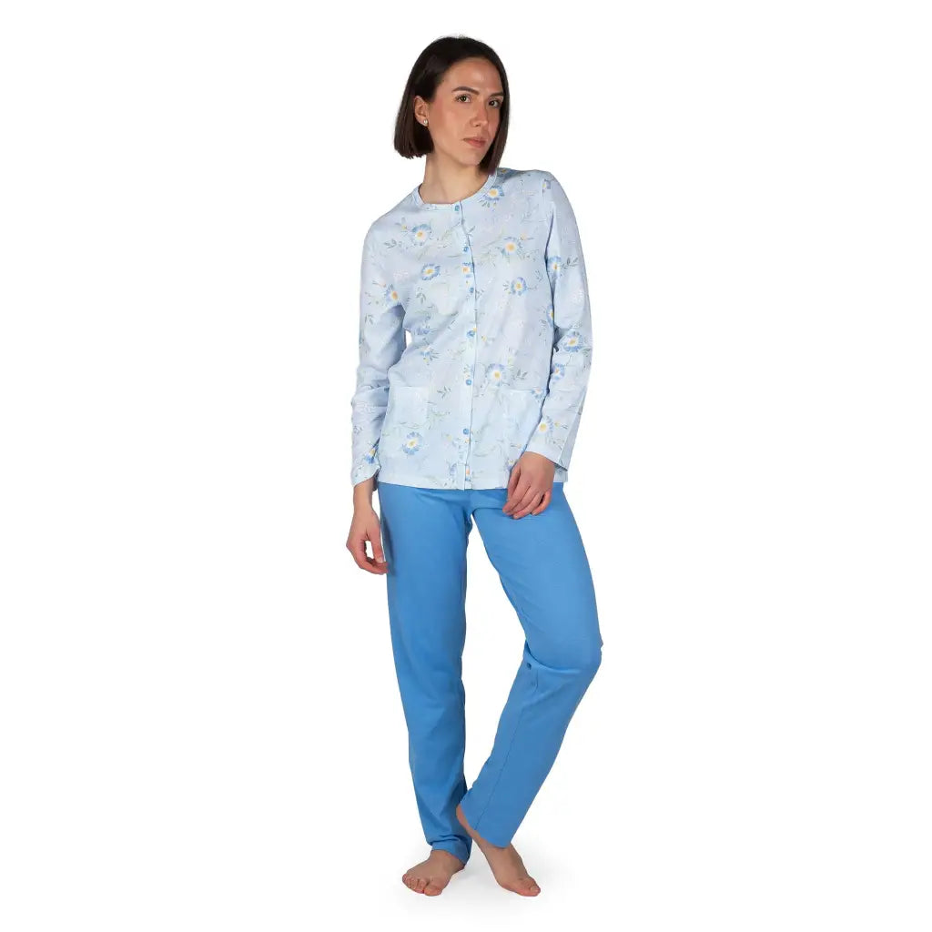 Pigiama aperto a manica lunga in puro cotone leggero di Linclalor. Questo brand storico da decenni veste le notti di moltissime donne con modelli sapientemente studiati e strutturati per garantire il massimo del comfort. Questo pigiama è realizzato, infatti, in una fantasia dai colori tenui e delicati sui toni dell'azzurro in molte delle sue meravigliose sfumature, per un effetto molto elegante. Il tessuto in puro cotone finissimo è molto morbido e fresco, perfetto per la stagione primaverile e per l'autunno. Il modello, con apertura frontale della giacca, è funzionale e molto comodo, sia per l'indosso che per eventuali necessità durante una degenza ospedaliera. Le tasche alla giacca sono molto pratiche. Il pigiama è interamente realizzato in un modello dall'ottima vestibilità ed in puro cotone fresco e finissimo.