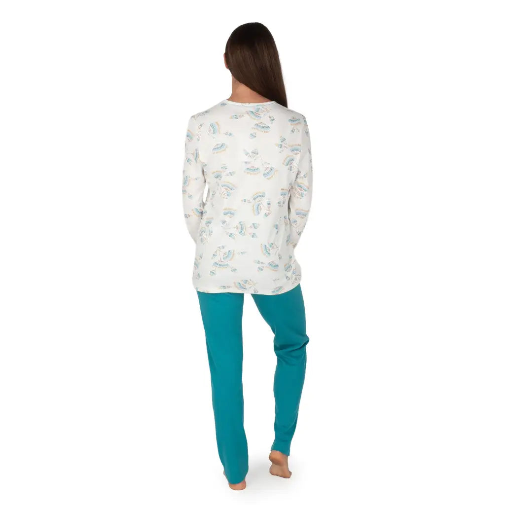 Pigiama a serafino a mancia lunga in caldo cotone inetrlock della linea Linclalor. Questo pigiama è molto particolare, realizzato in colori estrosi e inusuali, ha un design moderno e vivace. La fantasia sul fondo panna è un fiore moderno ed il pantalone in tinta unita è realizzato in un pieno e vibrante colore ottanio. Perfetto per le notti invernali, è molto caldo perchè realizzato in puro cotone interlock molto morbido e caldo.