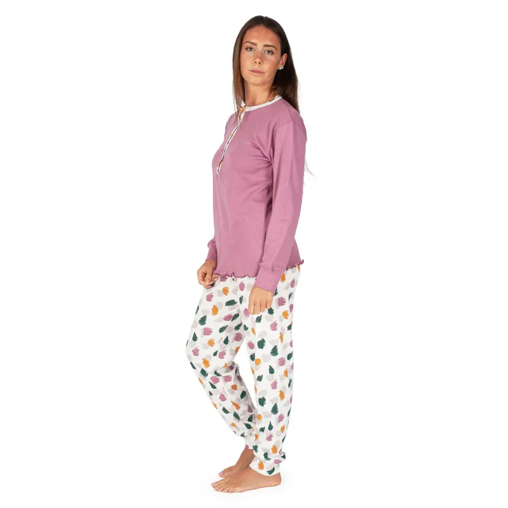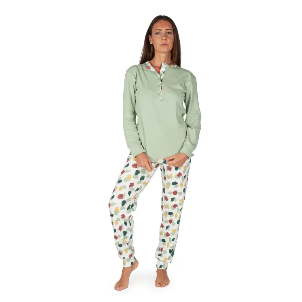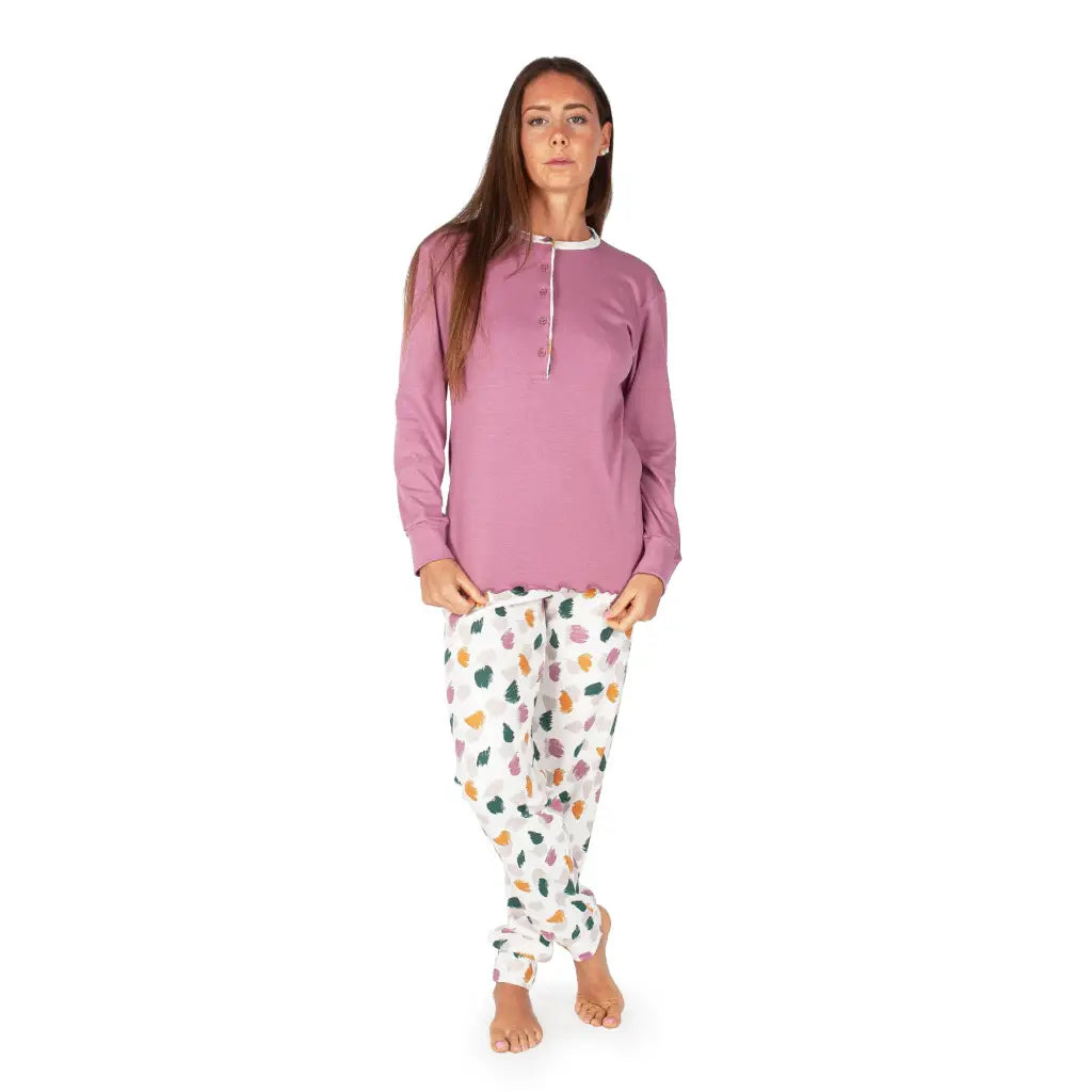 Pigiama donna lungo a serafino con polsini in fantasia pittura in caldo cotone interlock | mariottilab