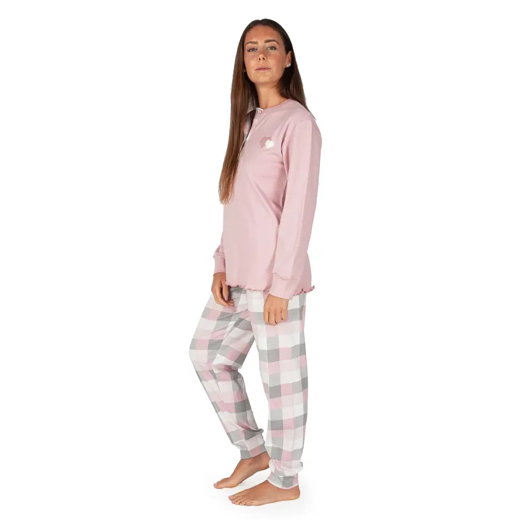 Pigiama lungo donna a serafino con polsini in fantasia quadri in caldo cotone interlock di MariottiLab. Tutte le collezioni di MariottiLab sono interamente disegnate e realizzate in Italia tramite lo studio e la ricerca dei modelli, degli stili e dei tessuti utilizzati. Il modello a serafino è molto pratico, e insieme ai polsini sia alla giacca che al pantalone risulta sportivo e giovanile. Il design di questo pigiama è semplice e pulito ma reso particolare dalla fantasia a quadri del pantalone abbinata alla tinta unita rosa della giacca. Il tessuto in caldo cotone interlock è molto morbido e caldo, perfetto da indossare durante le fredde notti della stagione autunnale e invernale. Questo pigiama si addice anche ad essere portato come completo casa durante le ore di relax.
