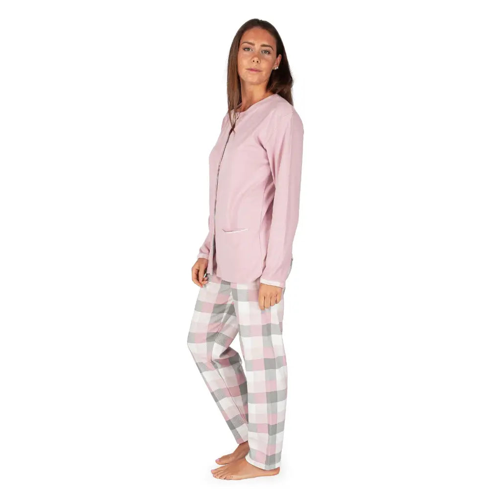 Pigiama lungo donna aperto davanti in fantasia in caldo cotone interlock di MariottiLab. Tutte le collezioni di MariottiLab sono interamente disegnate e realizzate in Italia tramite lo studio e la ricerca dei modelli, degli stili e dei tessuti utilizzati. Questo pigiama, grazie alla giacca con apertura totale frontale, risulta molto comodo e pratico all'indosso. Ha un design pulito e giovanile grazie dalla fantasia a quadri del pantalone dritto abbinato alla tinta unita rosa della giacca. Il tessuto in caldo cotone interlock è morbido e caldo, perfetto da indossare durante le fredde notti della stagione autunnale e invernale. Questo pigiama si addice anche ad essere utilizzato per una eventuale degenza ospedaliera.