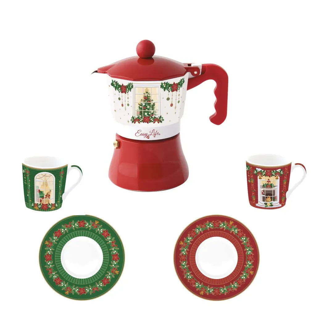 Set di 2 tazzine da caffè con Moka abbinata della linea Festive Avenue di Easy Life. Questo elegante set comprende due tazzine e una moka abbinata, perfetti per gustare un autentico caffè all italiana con un tocco festivo ispirato allo spirito natalizio. Il design raffinato e i dettagli a tema rendono ogni pausa caffè un momento speciale e caloroso, ideale per celebrare le festività con stile. Grazie alla confezione colorata che riprende la stessa fantasia natalizia, questo set si trasforma in un regalo unico e ricercato, perfetto per sorprendere amici e familiari con un dono che unisce tradizione, eleganza e un atmosfera magica. Un modo semplice e raffinato per condividere la gioia delle feste. Le tazzine ed i piattini in porcellana possono essere messi in lavastoviglie ed in microonde, la moka deve essere lavata a mano.